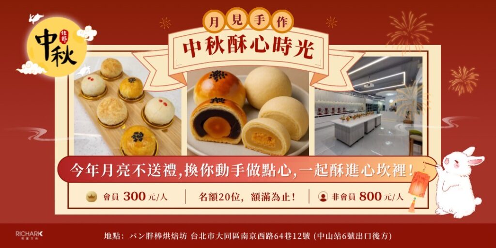【實體活動】9/30 《中秋節手作》中秋酥心時光 Posted on 2025 年 8 月 27 日2025 年 9 月 3 日 by Richark 中秋不只賞月,更要動手做月!今年中秋,邀你親手製作...