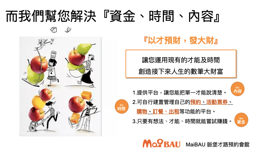 MaiBAU 脈堡才路預約會館主打,讓您運用現有的才能及時間,創造接下來人生的財富,提供平台,讓您能把你的才能說清楚,可自行建置管理自己的預約、活動票券、購物、訂餐、出租等功能的平台,只要有想法、才能、時間就能嘗試賺錢。