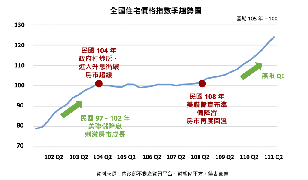 根據內政部不動產資訊平台顯示,台灣全國的住宅價格指數,已從 2010 年的 80,到 2022 Q2 已經漲到 123.97 左右,相較 2021 Q2 上漲 10.27% ,漲勢可謂相當驚人。就算遇上指數修正期,也沒有出現大幅度的下降,可見房地產穩定成長的特性。