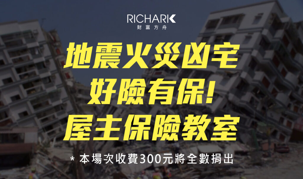 4/13(六)RICHARK特別邀請保險經紀人李來居,將為大家帶來一場「地震險/火險/凶宅險 如何保好保滿又有CP值」的專業課程,助你補充保險知識。
