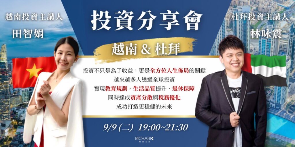 【實體課程】9/9 海外投資分享會《越南、杜拜》 Posted on 2025 年 8 月 18 日2025 年 9 月 3 日 by Richark 投資不只是為了收益,更是全方位人生佈局的關鍵。越來...